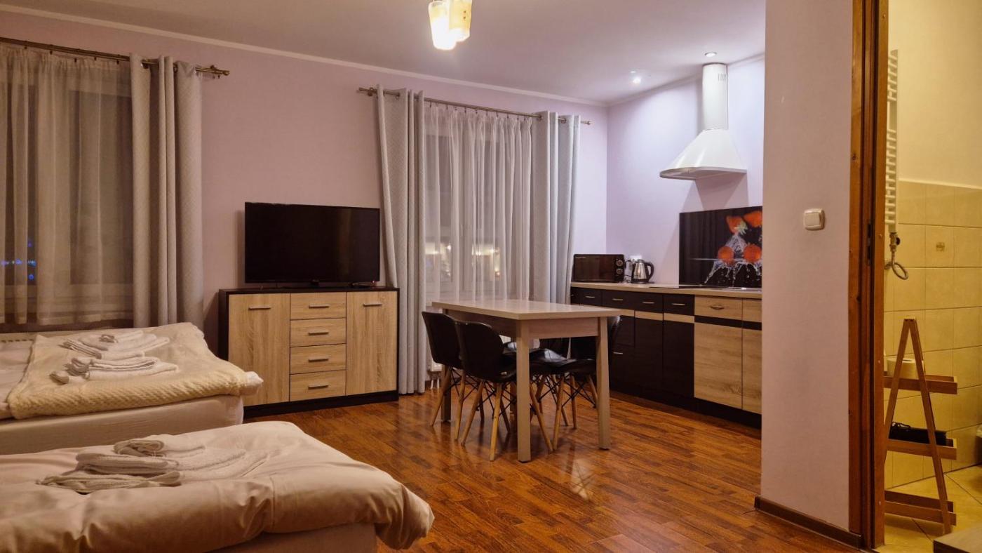 Apartament. This apartment is comprised of 1 bedroom, a kitchenette and 1 bathroom with a shower and a hairdryer. Meals can be prepared in the well-fitted kitchenette, which is fitted with a stovetop, a refrigerator, kitchenware and a microwave. The apartment offers a wardrobe, an electric kettle, heating, a flat-screen TV, as well as city views. The unit offers 2 beds. Apartament - 4 osobowy. Powierzchnia pokoju ok.: 35 mkw.